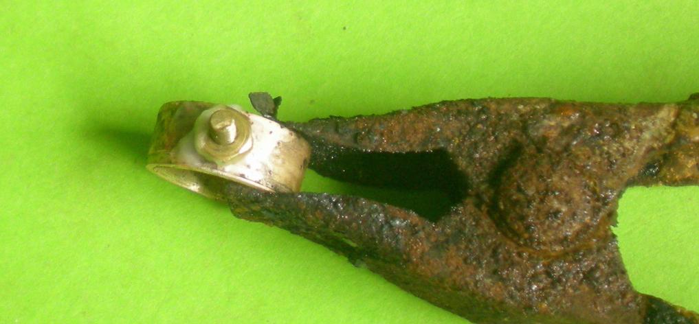 | Ensuite on scie la tige filetée qui dépasse à l'extérieur, on perce à 1.6 puis on taraude à M2. Pour faciliter le déplacement de la bague, la fendre, mais il faudra peut-être lui redonner un peu de sa forme en l'arrondissant car la mienne a souffert après l'épreuve du feu ... |