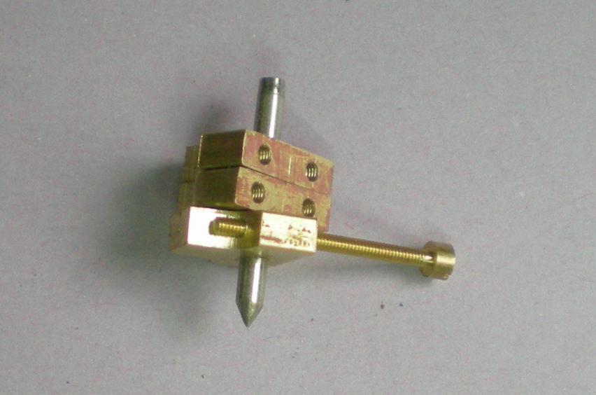 | Serrer la vis dans l'étau et placer dans la nouvelle fente un bout de rond de laiton de 1.5 de diamètre après avoir mis du flux. Placer de part et d'autre du rond, deux bouts de brasure d'argent (0.3 de diamètre) puis chauffer (lampe à souder).