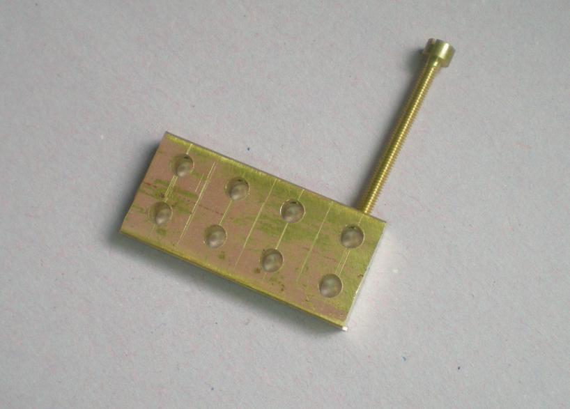 | Perçage en série de la barre de laiton de 15 x 4 : trous de diamètre 3 distants de 7 mm. Sur le sommet, perçage à 1.6 et taraudage à M2 pour le futur blocage. |