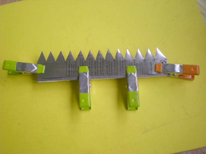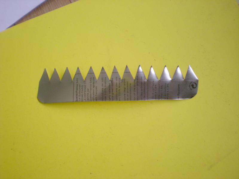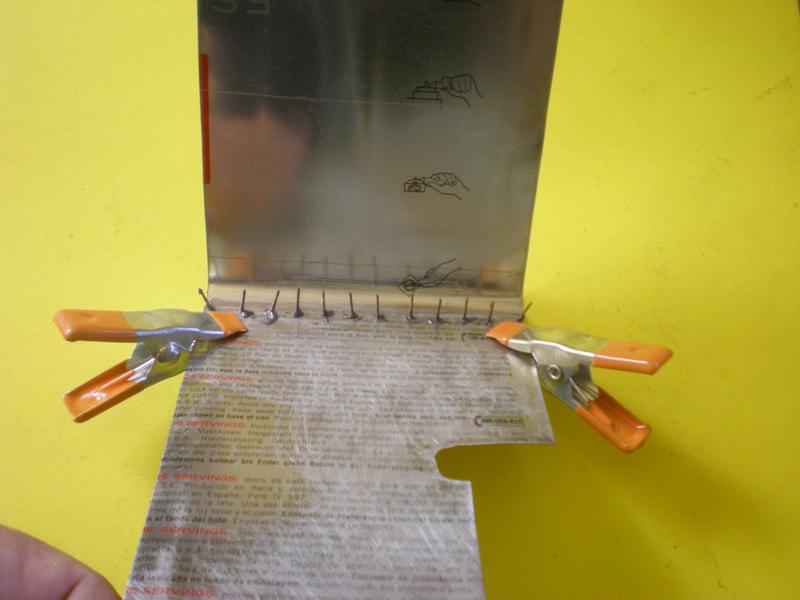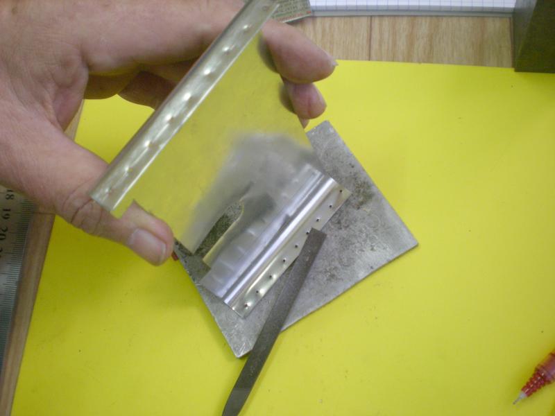 | Préparer des bandes en alu de 2 d'épaisseur et de la largeur de l'intérieur des pinces. Léger pliage à une extrémité.