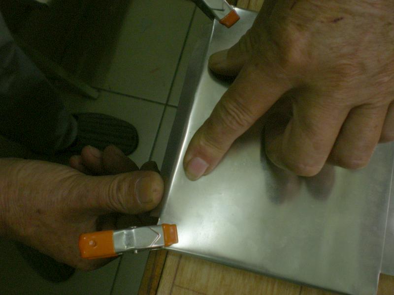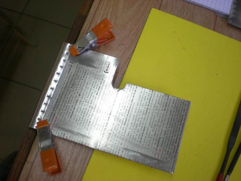 Après découpe (prendre les mesures sur le cadre obtenu en prenant en compte l'arrondi et le recouvrement des tôles), serrer la tôle sur un plat d'alu. |