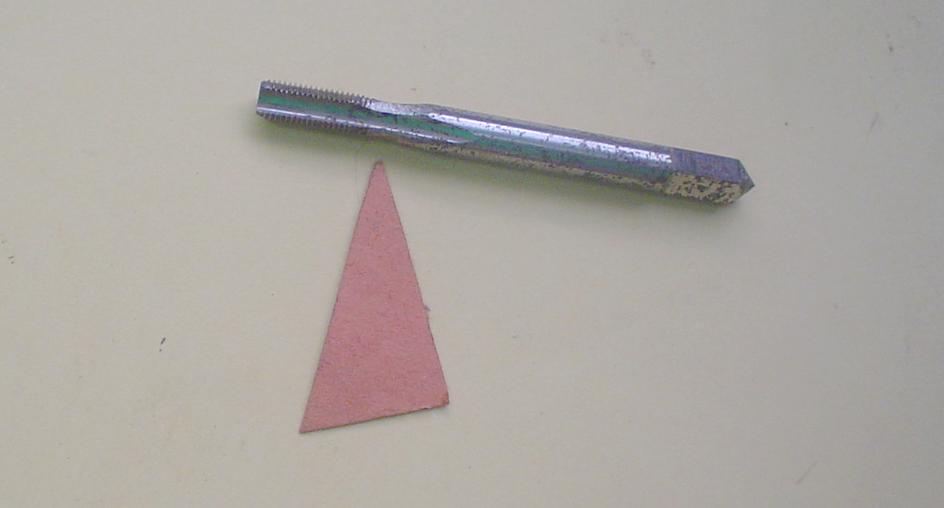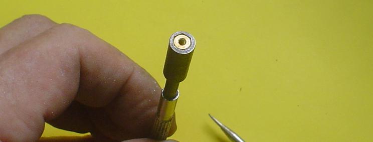 Et il ne reste plus qu'à visser notre tige et, pourquoi pas faire une petite brasure à l'étain. En réalité, le cône prescrit fait 120° et est obtenu avec la pointe d'un foret ... mais 60° convient bien et est plus rapide à obtenir. |