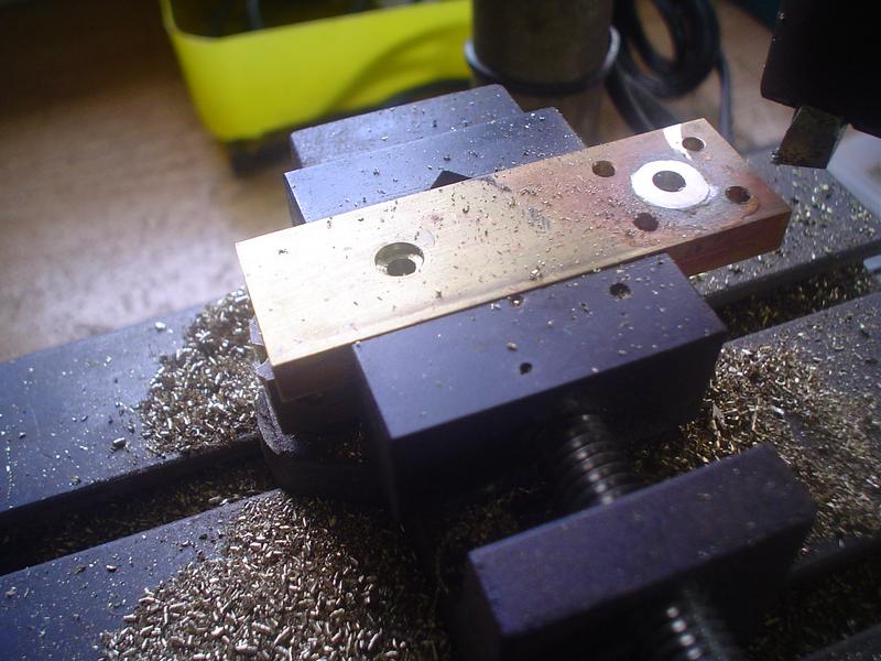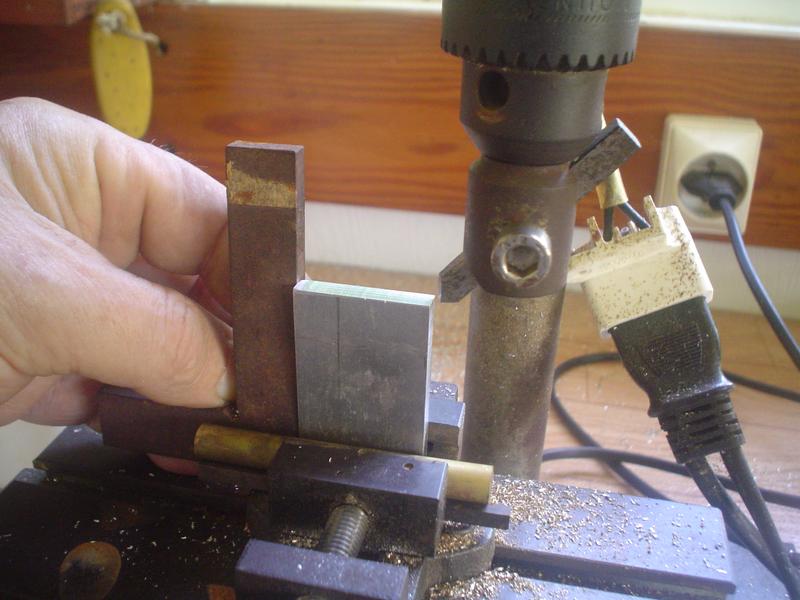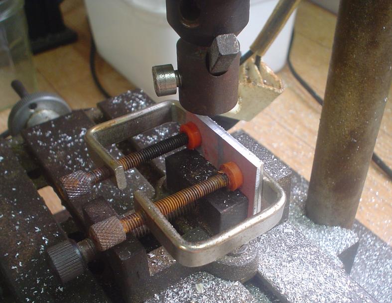 | J'ai dû recommencer : trou d'échappement du mauvais côté ! L'occasion de monter un montage plus performant pour les perçages : avec le calage, pas de fléchissement.