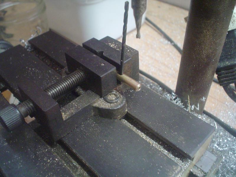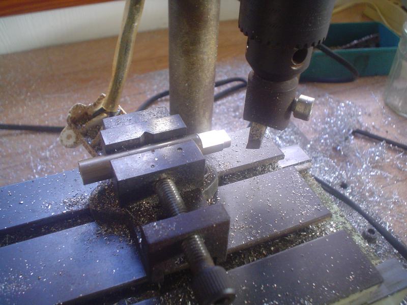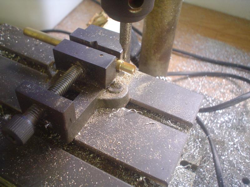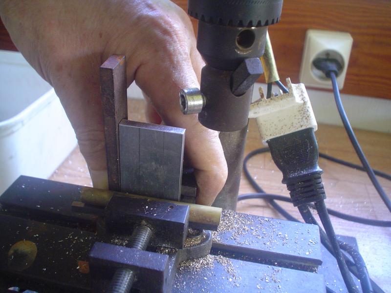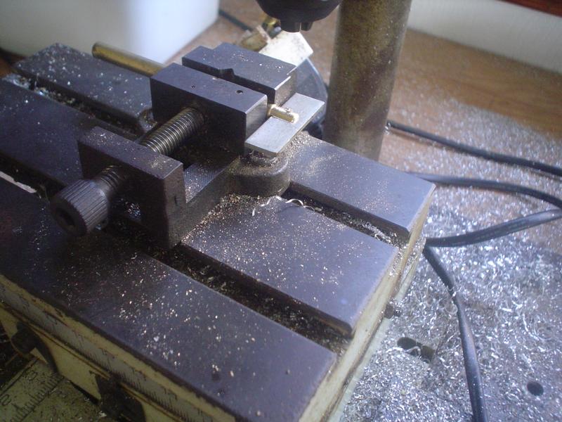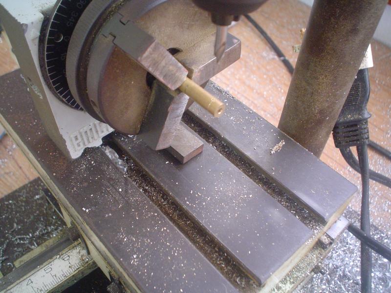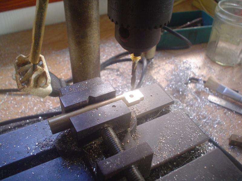 commencer par percer à 1.6 sur un 1/2 diamètre et bien dans l'axe un rond de laiton (ici de diamètre 5) préalablement percé au diamètre de la goupille et du maneton ; ensuite, taraudage à M2 |