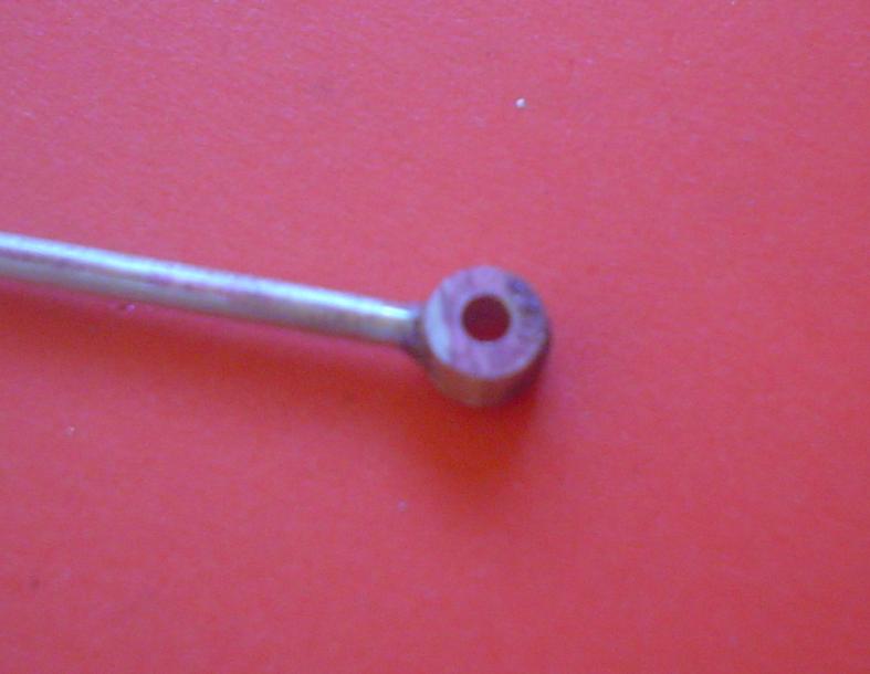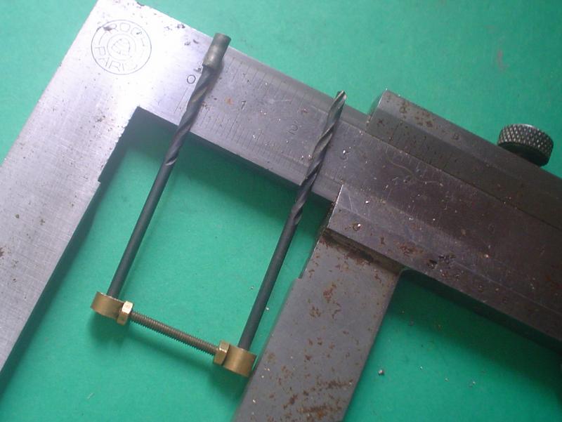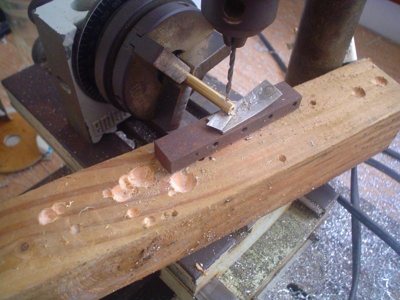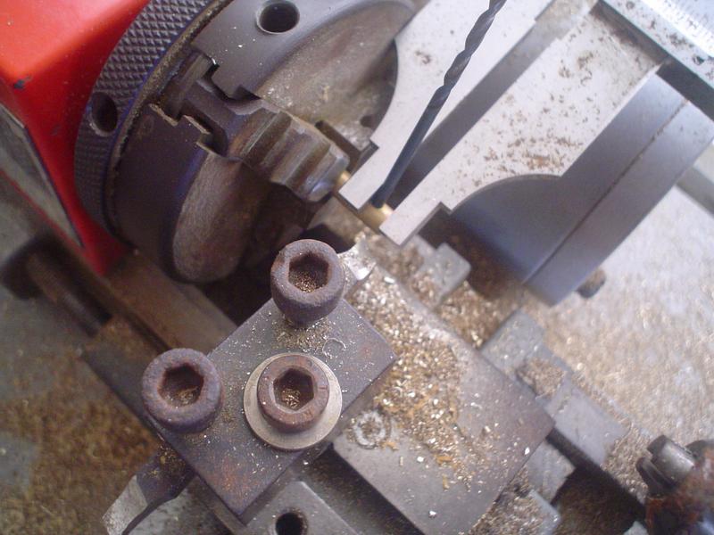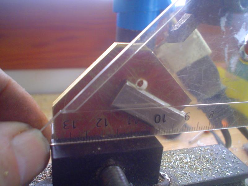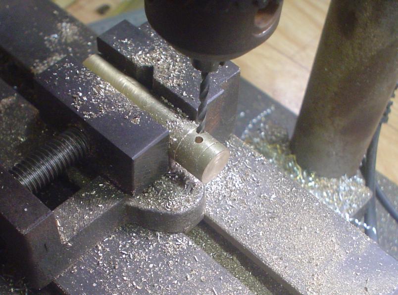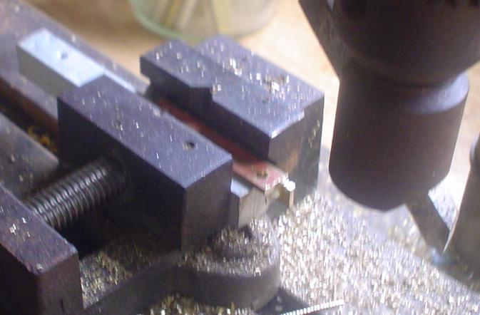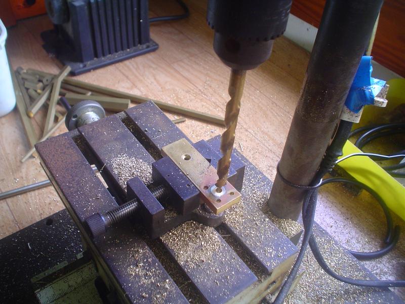 commencer par percer à 1.6 sur un 1/2 diamètre et bien dans l'axe un rond de laiton (ici de diamètre 5) préalablement percé au diamètre de la goupille et du maneton ; ensuite, taraudage à M2 |
