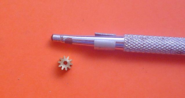 Ce pignon de module 0.5 fait 6 de diamètre extérieur. Pour bien le maintenir dans le mandrin, il faudrait une bague refendue de diamètre 6 intérieur et quand on n'en a pas ...on prend un bout de tube de diamètre intérieur 5, on le refend et on l'agrandir légèrement avec un pointeau : une fois d'un côté puis de l'autre pour que ce soit parallèle. |