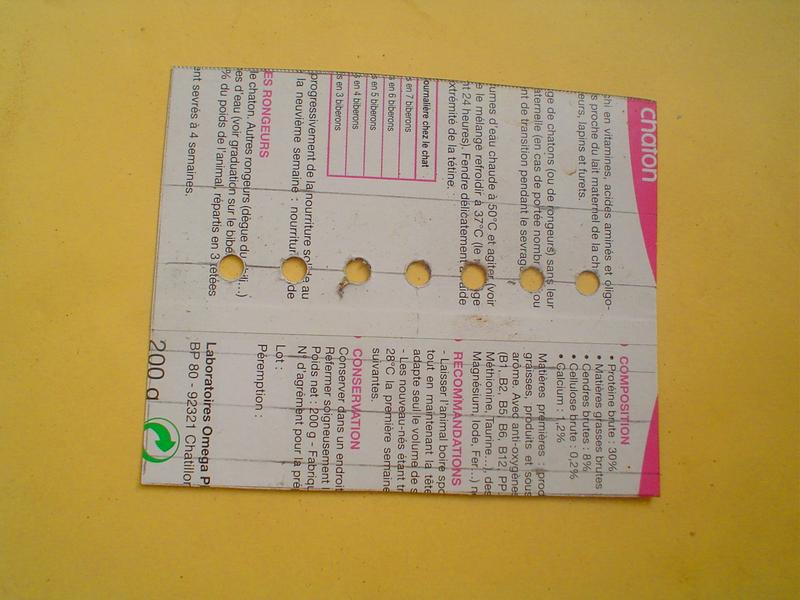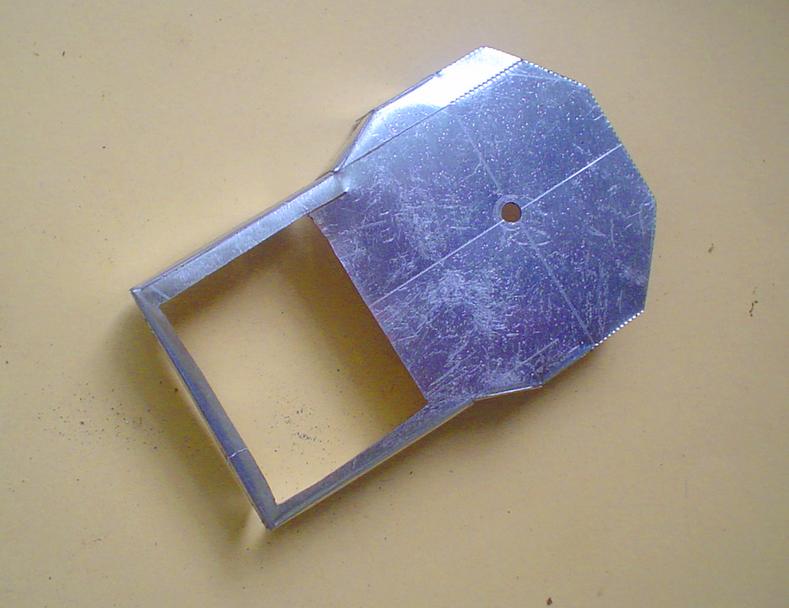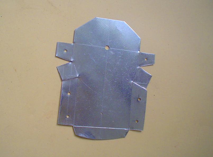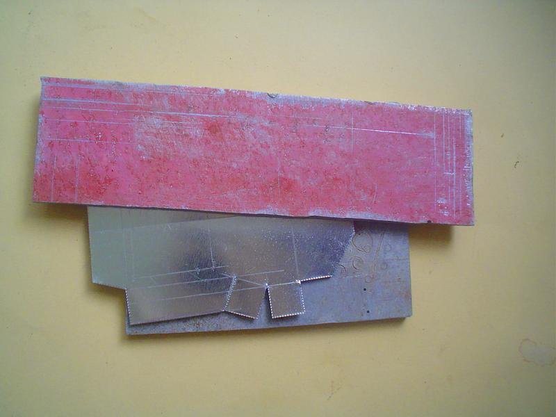 Découper à la cisaille : la mienne est crantée et ce n'est pas joli ! Par contre, cette faible épaisseur n'aime par la scie fine ... Percer les futurs trous de fixation et repasser les traits avec la lame d'un gros cutter. |