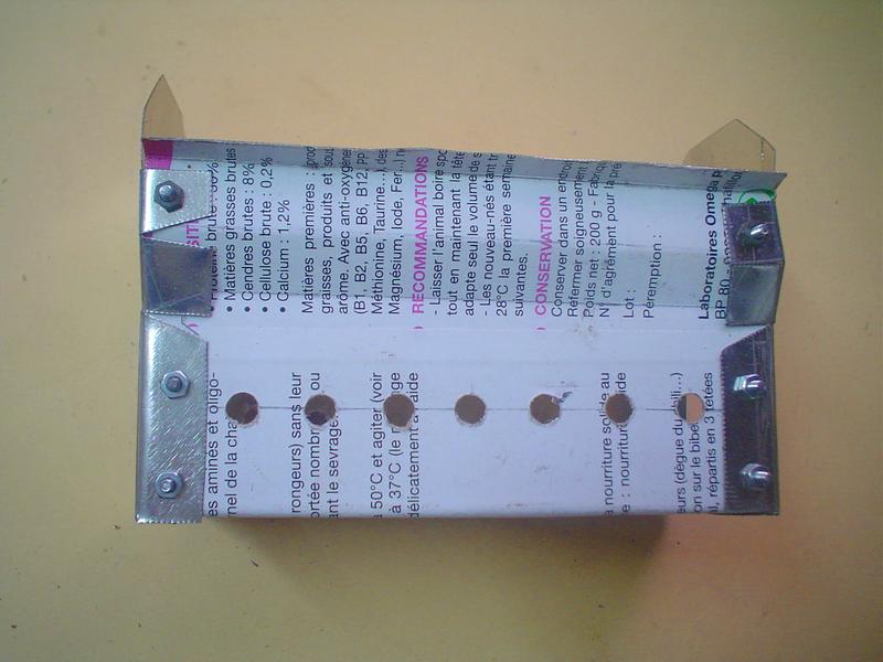 | En se servant des trous percés sur les flancs, on peut percer ceux des côtés soit, en les repérant (pas évident, soit en présentant les deux tôles ... pas évident non plus mais avec divers morceaux de bois serrés dans l'étau, on y arrive. |