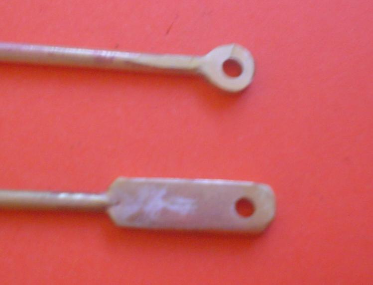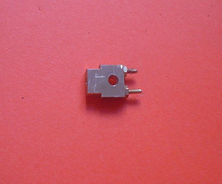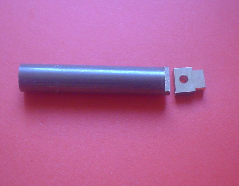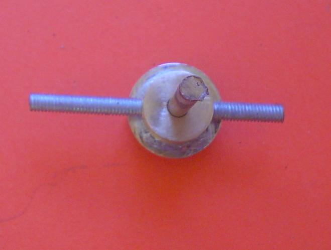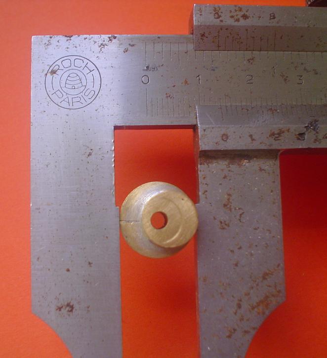 Matériaux et préparation : . 2 bouts de ronds de diamètre 10 dont on surface une extrémité , l'un de 7 ou 8 mm, l'autre de 4 ou 5 de longueur . 1 rondelle tirée d'un rond de diamètre 18 et de 2 ou 3 mm d'épaisseur dont on surface un côté . percer le rond de 10 le plus long au centre ainsi que la rondelle au diamètre 3 . percer le rond le plus court à 2 mm du centre et à 3 de diamètre |