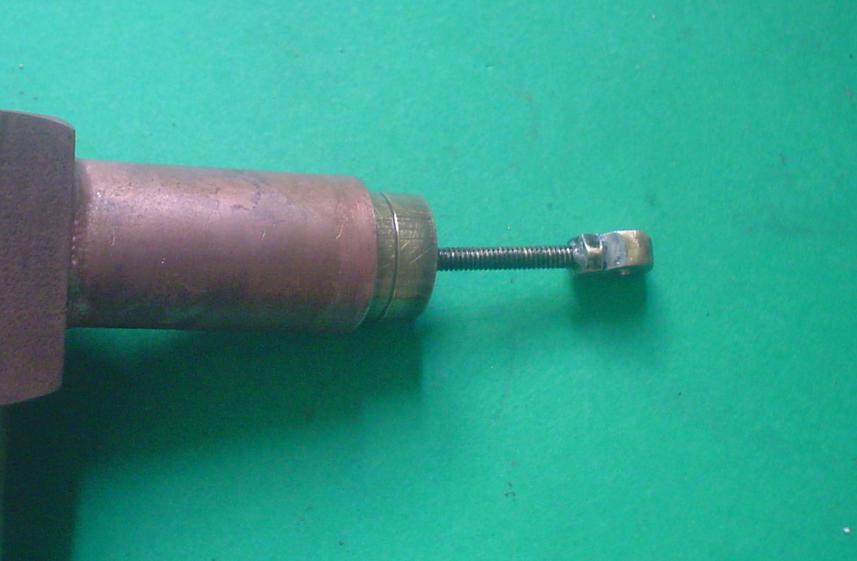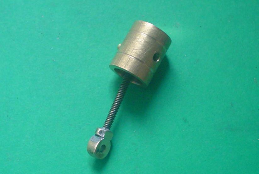 la partie basse du piston est réduite d'1 mm pour autoriser l'oscillation en bas de cylindre alors qu'il se trouve à mi-course ; perçage d'un trou de 2 sur la longueur de l'articulation (8 mm), et, si possible avec une pince, réalisation de deux petites saignées en V qu'on reprendra avec le bout d'une lime ronde pour ébavurer |
