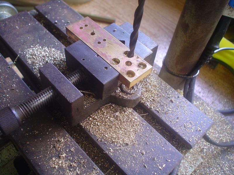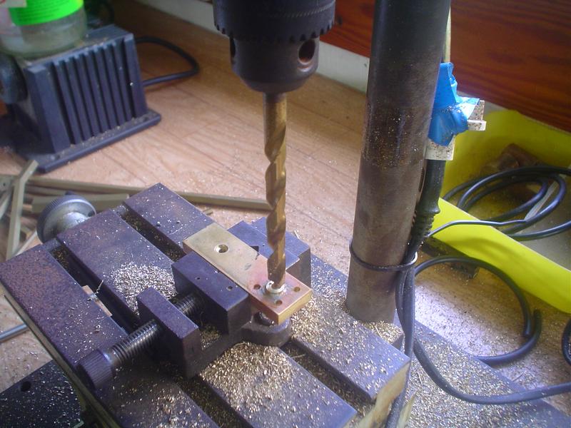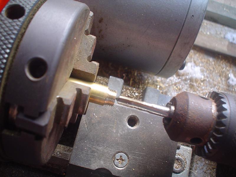 Les trous devant recevoir les viroles sont percées puis ... taraudées : ici taraud de 8 pour recevoir un rond en laiton de 10 dont on fileté l'extrémité sur 5 ou 6 mm. |