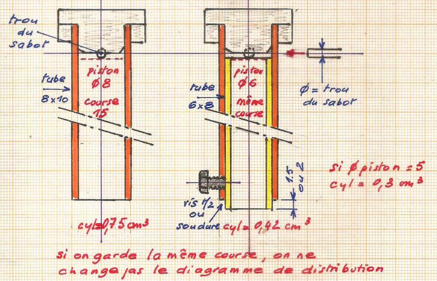 Comment retrouver ce rapport sans reconstruire un moteur ? En réduisant la cylindrée du moteur : si on remplace le piston de 8 de diamètre par un piston de 6, la cylindrée tombera à 0.42 cm3 et le rapport sera de 2.76/0.42 = 6.57 que l'on va essayer. Et si ce n'était pas suffisant, on pourrait installer un piston de 5 mm de diamètre ...et le rapport passerait à 9. |