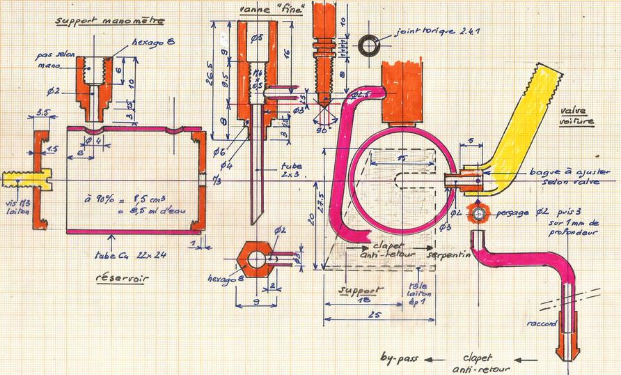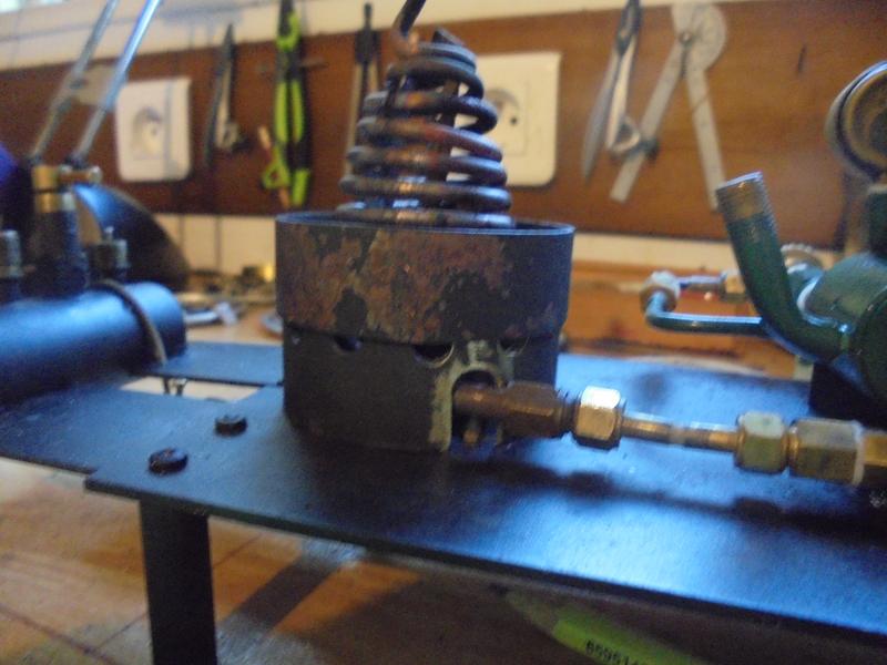 Des liaisons : . une vers le serpentin avec un clapet anti-retour : si on s'en passe le moteur va tourner par à-coups. . une vers la vanne by-pass avec clapet anti-retour sinon on ne tient pas la pression atteinte, vanne à déplacement rapide et on verra à l'usage comme elle est utile pour ne pas détruire le mano.