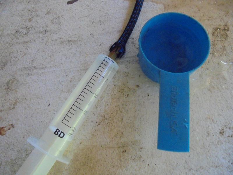 Fermer la vanne fine, installer le clapet anti-retour menant à la vanne by-pass et pomper avec une seringue dans laquelle on a mis de l'eau et qui se termine par un embout de gonflage de vélo. En fait on ne le remplit pas car à un moment la seringue rencontre la résistance de l'air qui s'accumule en haut du réservoir. Mais ce remplissage testé sur un autre réservoir tampon à 90% permet de compléter facilement la pression du réservoir avec la pompe manuelle. Ce remplissage ne sera nécessaire que lorsqu'on ressortira la machinerie après une longue période sans utilisation ou la sécheresse du siècle ! |